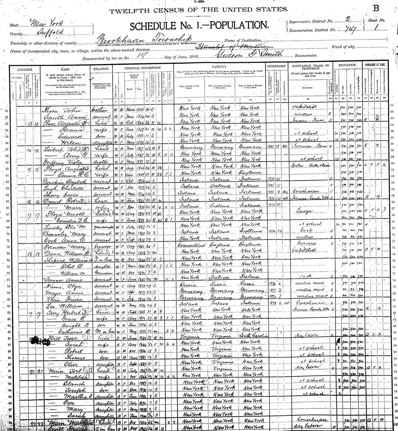 The Dysarts Robert & Mary (line 65) probably worked for both August Floyd and brother Nicoll & Cornelia Floyd whose estate Tuppenac was just "next door" Mary Dysart was included in several of the Floyd wills. Living with Nicoll & Cornelia is their grandaughter Ella Marian Lindley. Ella's mother Marian died soon after Ella was born. Ella would first marry W E Baker and live at Tuppenac and in the late 1920's became the second wife of William Shepherd Dana. Nicol Floyd, a lawyer employed two domestics , Mary Donnoley and Anna Cook plus Mary Evinden who was a governess for 12 year old Ella.