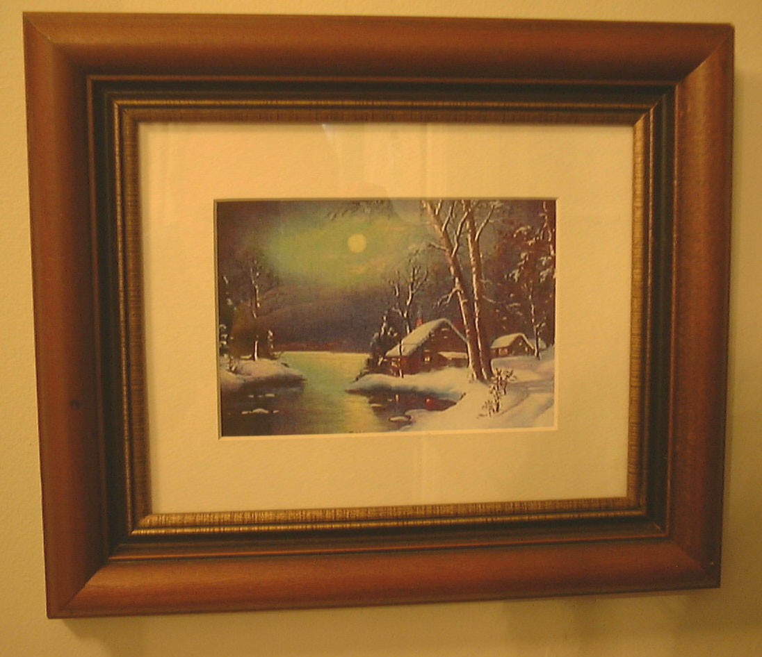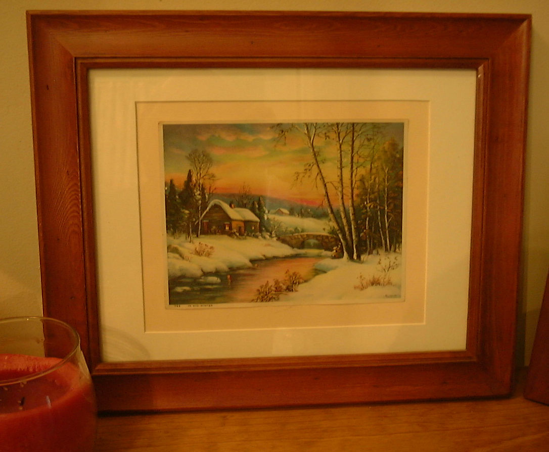 These two snow scenes were done by famous landscape artist William M. Thompson. Around 1955 my sister did some very fine copies of them that she took off of Christmas gift boxes. Her paintings hung in our Mastic Beach living room until we left. She now has them at her home in Michigan. It was great to see them again and imagine my surprise when I found out 50 years later who printed them. CO INCIDENCE ????