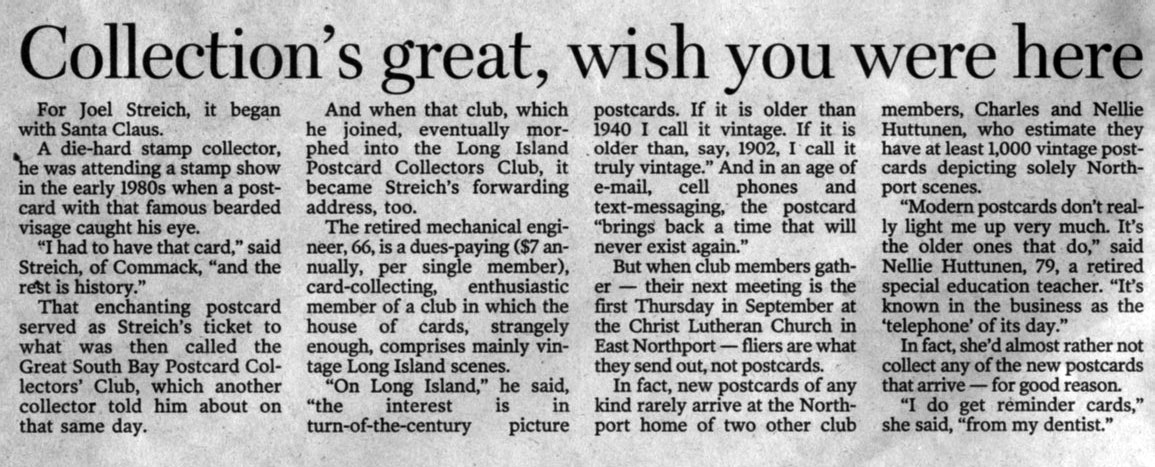 C Back in August of 2004 when I was catching a plane at Islip McArthur Airport to get back home, I picked up a Newsday and as soon as I opened it there was my "Post Card Go To Guy" Joel Streich of Commack, LI staring back at me. Joel has been supplying me for four years now with some very rare views of my home town and vicinity that are all through out the Knapps Lived Here website... I just thought I'd tip my hat to him here ...and here is a link to the Great Post Cards He Offers On EBAY