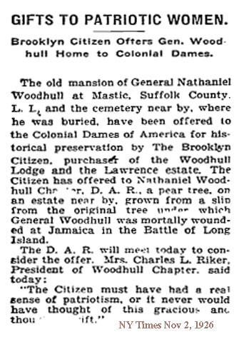 When the Smadbeck Brothers (Home Guardian Company) bought the Lawrence estate in the winter of 1926 to begin the development of Mastic Beach, Nat's house was included with deal, It was probably vacant for a long time and they may of thought of it as a door prize. I believe there was a fire in it at one time? By the fall of that year the Smadbeck's offered it gratis to the Colonial Dames of America and a Pear Tree from Corn Court to the D.A.R. Daughters Of American Revolution ...they also were more than willing to throw in the nearby graveyard.