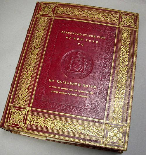 WAS THE GENERAL's DAUGHTER. THE CITY OF NEW YORK PRESENTED HER WITH THIS SCRAPBOOK ON HER FATHER IN 1825.