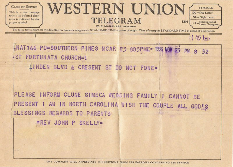 And speaking of Father Skelly here's a telegram he sent to Len Clune & his bride Monica Scimeca in 1956. By this time Fr. Skelly had long been transfered out of St. Jude's to another parish in Bayside Queens, but it is obvious he was not forgotton. Long forgotten though was his big plans for the Knapp Mansion and by 1956 it lay abandoned and very torn up.
