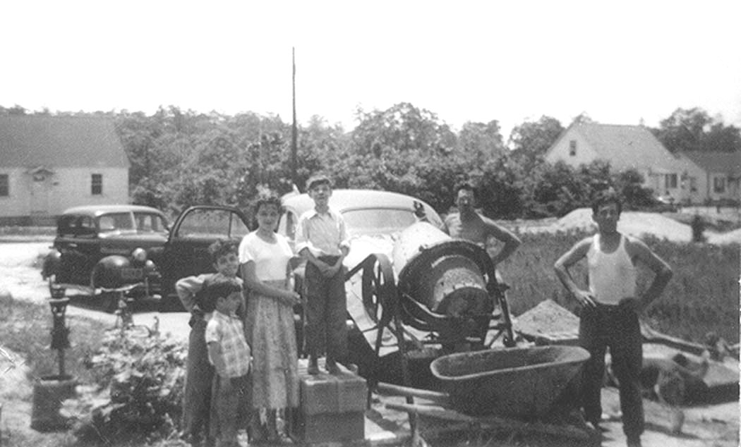And Speaking Of Cars.... check out the car with its rear axel hooked up to the cement mixer. This photo of Alicia Patera's Aunt Camile and family is taken on Meadowmere Dr. in the original Mastic Acres area. They are building a garage.