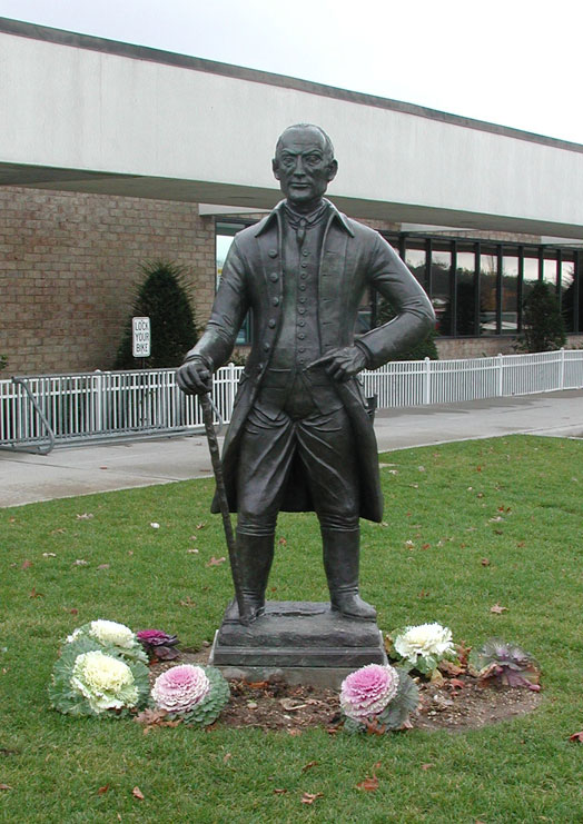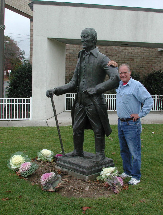 But first we had ourselves some lunch at the ever appropiate "William Floyd Diner" so aptly named because of it's location ( right on the parkway and just a short walk to the original school) Martin opted for the "William Special" a grilled chicken platter that I'm sure would of astonished "The Signer" if he was ever served such an item. He said it was very good.... As for me ..well you can't go wrong with a cheeseburger now can you? It was while at lunch Marty said "I've got some bad news for you".........before I could really get anxious about what that might be, he blurted it out " Before I left the house, I got a phone call from the library and there is a reporter waiting there for you since 11 AM!" ..... "A reporter from where?", I asked "The Press of Manorville", he said. "Well if it's Ms. Linton she's a little early", I said. "She called me last week in Nashville and we set up the appointment for 11 AM on Tuesday". We ate our lunch and headed over to the Library which isn't but a stones throw from the diner. We were met outside by someone new since I was there last year. Why it was none other than "The Signer" himself standing sentry like over the establishment's entrance. His pal Tom Jefferson who visited Will in Mastic after the Revolution, once had a fine library too, but Tom got himself into some financial difficulty and the government got a hold of his books. Today it is called The Library Of Congress. Will was having none of that Thom Foolery from these two refugees from his school house down the road and he was looking quite protective!