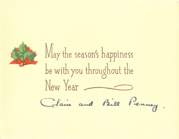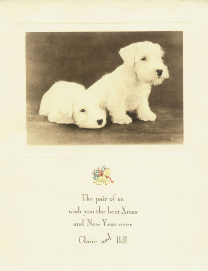 These two custom Christmas cards were sent during the season in the mid 1930's by Claire Knapp Penney and her husband Willis Oliver Penney to Leon Iriberry an AKC Judge and came to me from Iriberry's estate. It was a great pleasure for me to give them as an early Christmas gift to Peggy Norton one of Claire Knapp's grandaughters, who visited me here in Nashville recently. And now what better time to share them with the world ! It's been really hot here this week of July 1, 2007 (Claire's grandfather Joseph Fairchild Knapp's birthday ). The photos of her adorable Sealyhams were taken by reknowned dog photographer Rudy Tauskey The handwriting is Claire's and it's the first time I have seen Willis called "Bill" in print.