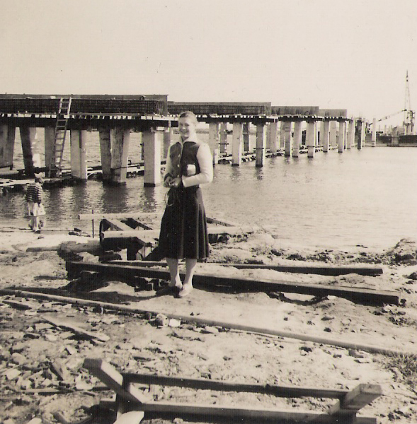 Here is Joan Jendral in 1956 At Smith Point. As You Can See Somethings Goin' On In The Background Besides Her Little Sister Wanda Looking For Horseshoe Crabs. Next week It will be 49 years ago when the bridged first opened ( July 4, 1959 )