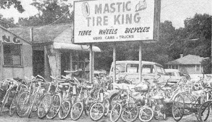 John Moraldo Opened His Used Tire King later to be called Mastic Tire King in the late '50's selling primarily used tires and what was far worse "Regrooved" ones . Not sure when regrooving tires that were fit for boat bumpers was outlawed in NY State But I Don't See Any Sign Of Them Here. He Also Sold Used Cars & Trucks.... Hey John How Much For The Willys Wagon? As you can see he was a phrophet too, stocking up on bikes anticpating 50 cents a gallon gas that would send us all looking for bikes. Johnny B. Moraldo Was No Dummy & He Had A Sense Of Humor Too