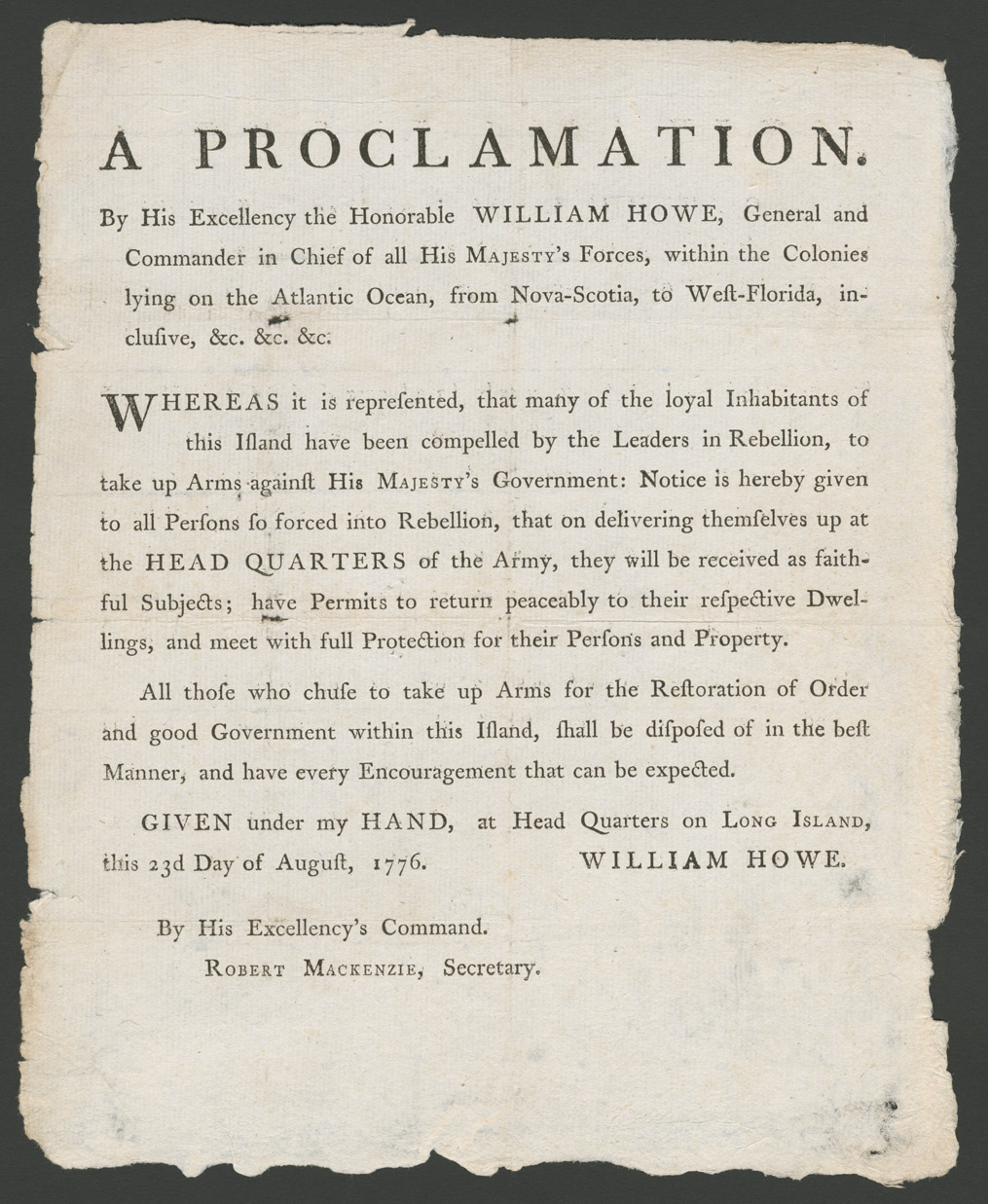 HERE IS A PROCLAMATION FROM GENERAL HOWE TO THE CITIZENS OF LONG ISLAND TELLING THEM IF