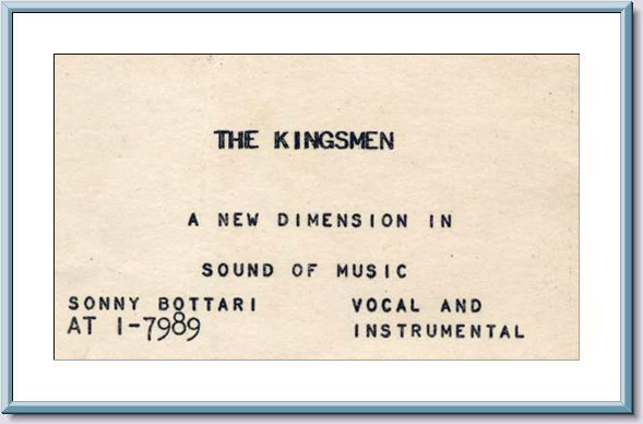 The Earliest Known Card Of THE KINGSMEN Circa 1961 When Sonny Was Still In The Air Force Stationed At Westhampton. It Appears. He Hadn't Thought Up His Stage Name SONNY STYLES Yet. He Probably Wasn't Earning The Big $$$ He Later Would Either As, It Looks Like It Was Done On A Typewriter .....