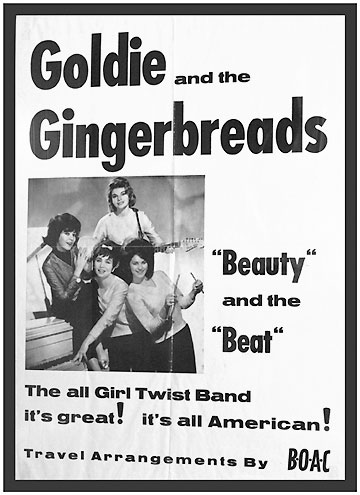 The band toured Europe in the early 60's with groups like The Rolling Stones, Kinks, Hollies, The Animals and more. They recorded for Decca, ATCO and several other major labels. They were known for being the first to record, "Can't You Hear My Heartbeat" ( a song they intensly disliked) but had chart success with it in the UK while British band Hermans Hermits had a bigger hit with it here in the US. But that's the music biz. After the Gingerbreads split up, Goldie went on in 1968 under the name of Genya Ravan and founded Ten Wheel Drive, a 10 piece jazz rock horn band which cut several albums for Polydor. The Gingerbreads, Ginger, Margo and guitarist Carol MacDonald formed an all female Jazz Rock horn unit called Isis that also made several major label albums.