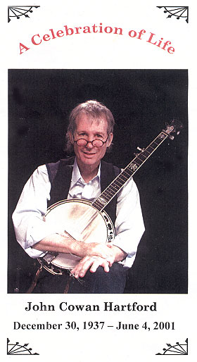Friends,At 3:30pm, Nashville time, on Wed. Jan 02, Susan Marie Hartford was buried next to her beloved husband, John Hartford. John had died less than six months prior. At the request of a mutual Nashville friend, a final farewell salute was blown aboard the GRAND VICTORIA II, on the Ohio River at mile 506, casino boat at the same time that Marie's funeral began, some 400 miles to the Southwest. Capt. John Leed, a dedicated John Hartford fan, is shown on the enclosed mpeg file blowing the GRAND VICTORIA II's three-chime whistle, patented in