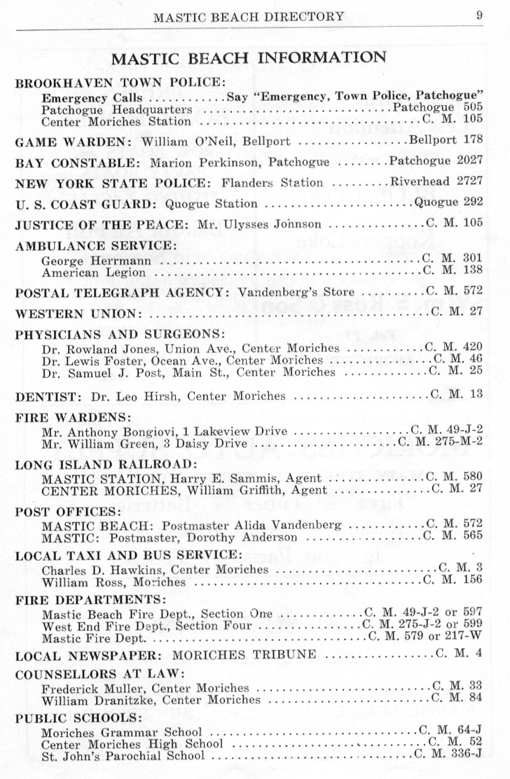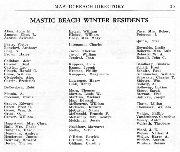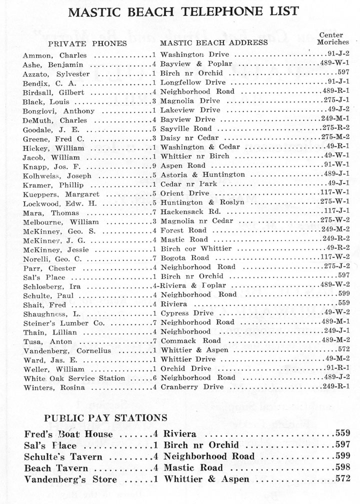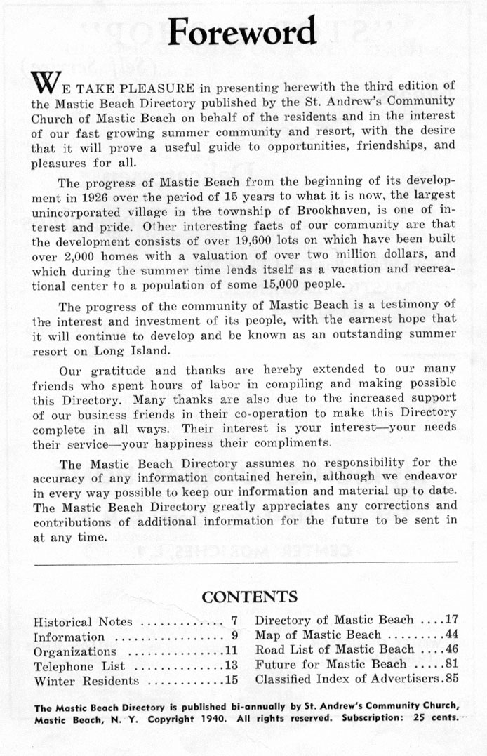 This latest little gem I found on E Bay. Each book has provided me different information on Mastic Beach history . I also have been happy to do lookups for folks who have e mailed me, and of course will still be happy to. With the little town still split in two by the Knapp estate as the first ones came off the press, the last two editions also answer some questions and provided a few surprises about what happened after Dodi Knapp sold off his property. This one too answered a few more ????? And then of course there are the ads of places long gone. At the end of this addition are links to all the other ones I have posted on the site .