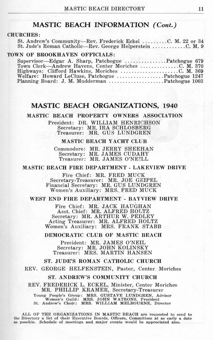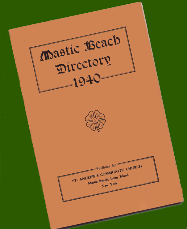 With the recent aquistion of this little 88 page book I now have the complete set of St. Andrew's Mastic Beach Directorys. The very first one was a gift from George Barnes, an old Floyd classmate of mine. When I first started this project in 2001 George presented me with the 1942-43 edition which was the last one published . George's Dad "Denny" Barnes was a Mastic Beach pioneer and very active in all sorts of civic duties. That was followed by the the very first one from 1937, a gift from Mrs. Estelle Schulz who regular readers of the website or even casual ones should know the name of. Estelle who's maiden name was Parr, is a Mastic area native having moved there as a little girl. The Parrs go back in Mastic to 1922 when Estelle's grandfather opened his first service station on Montauk Highway (Mastic Liqour Store Today). Her father William and his brother Walter had the Parr Brothers Service Stations in both Mastic & Mastic Beach directory. The Parrs were advertisers in all four issues not to mention the folks who worked on the cars and boat engines for The Danas, Smiths, Floyds, Tolfrees and Knapps. I then was sent the 1938 directory from website reader Carolyn Capel who grew up there. Both her grandparents the Capels & Linkhs were Mastic Beach pioneers.