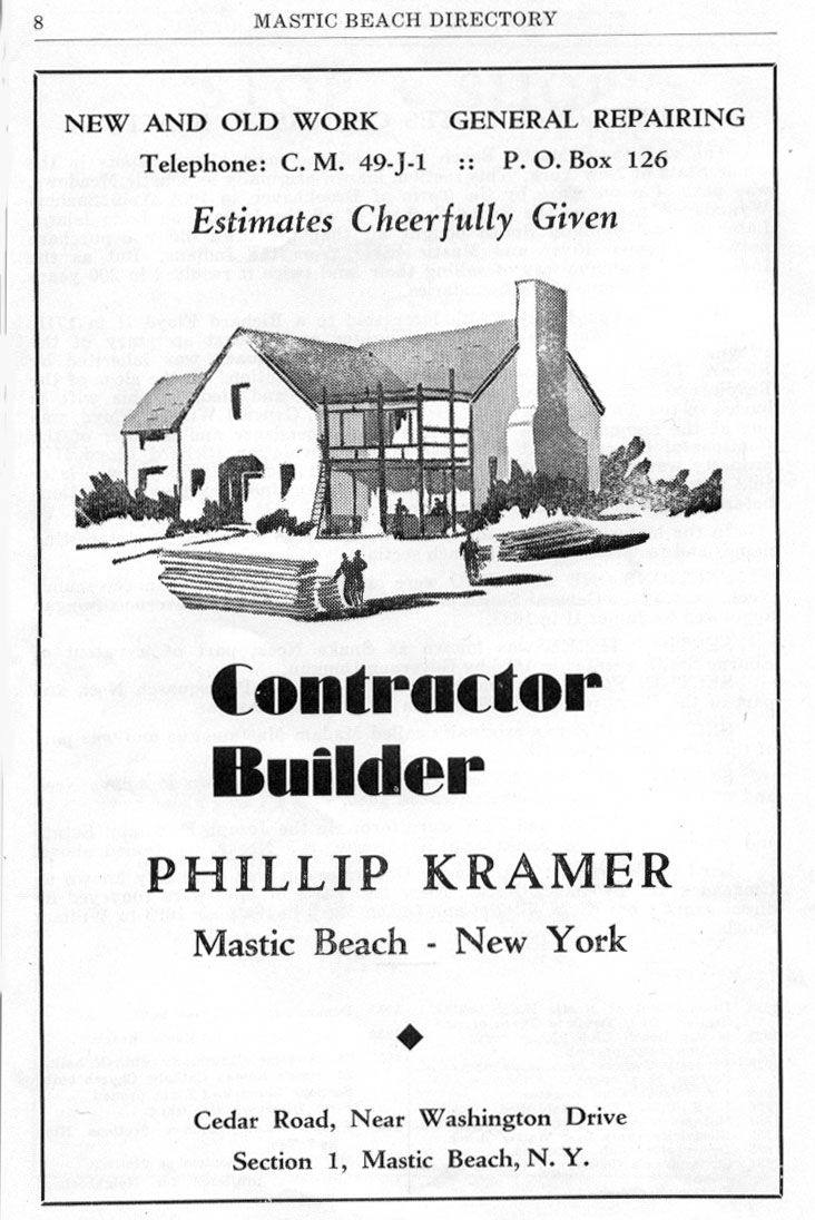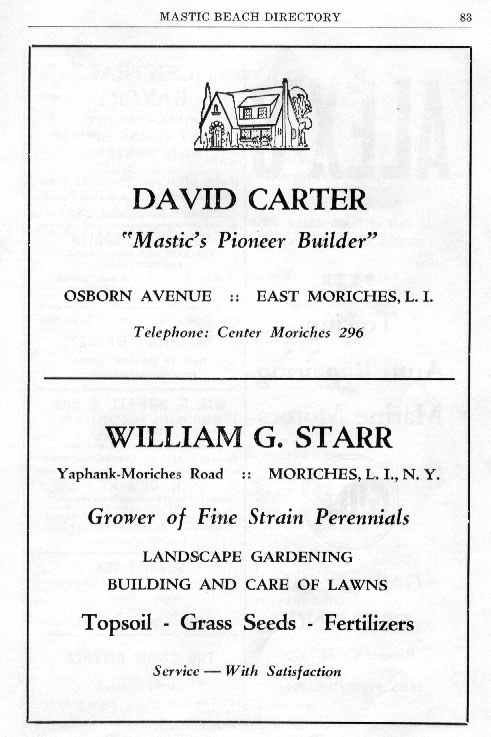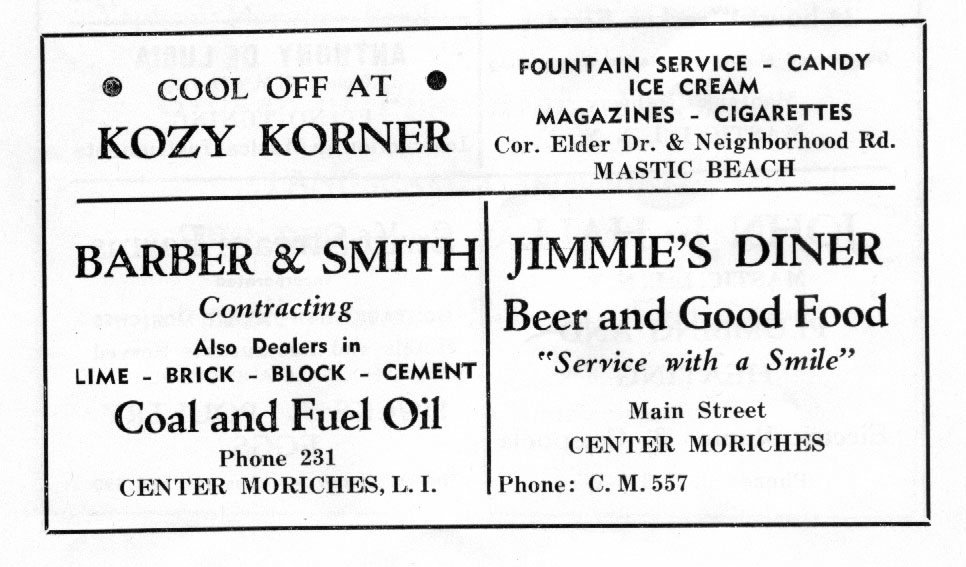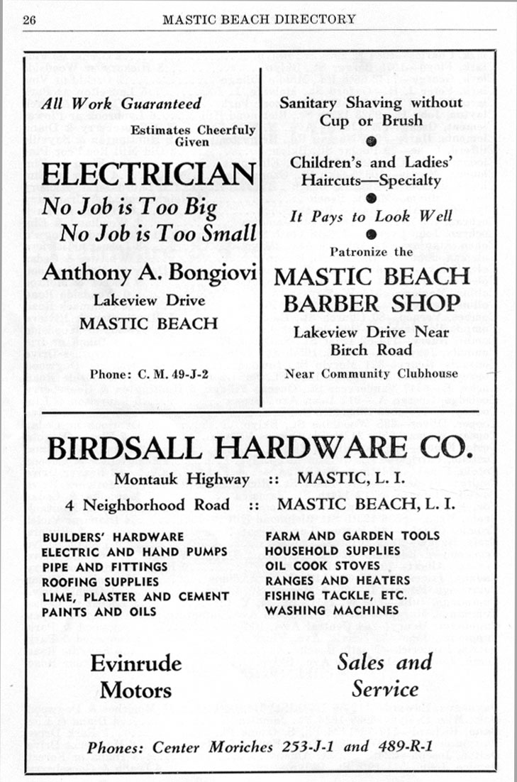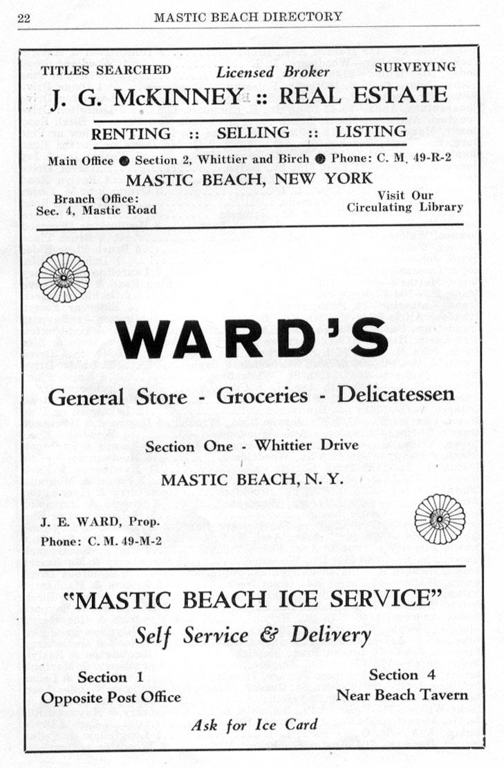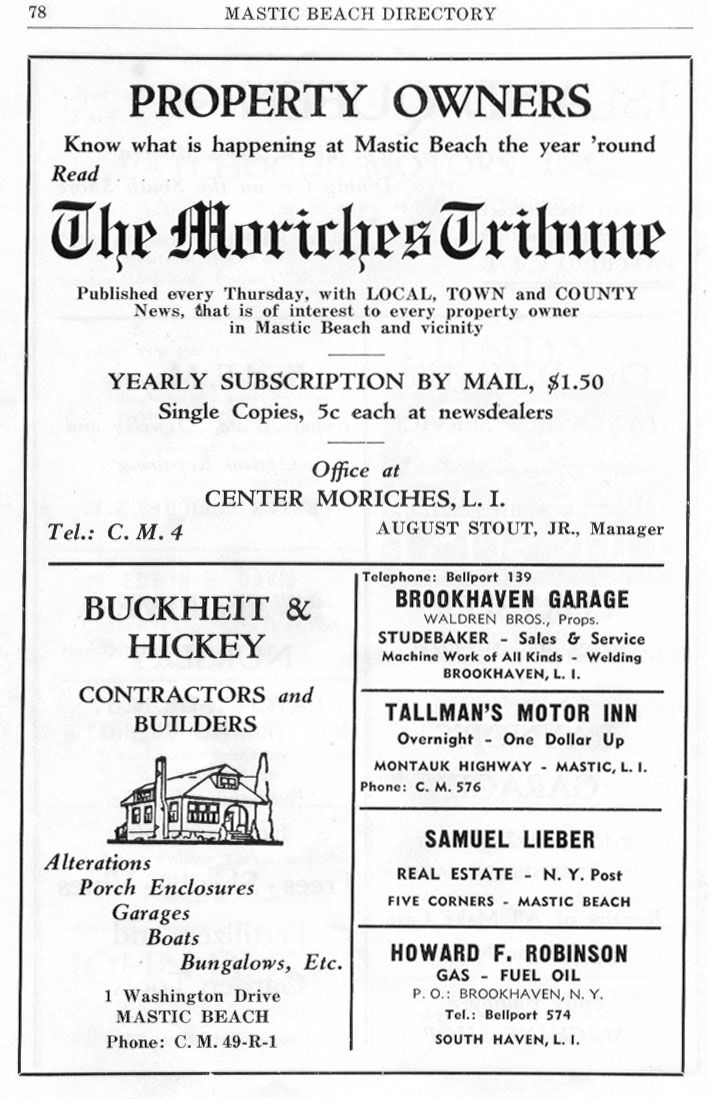 THE WALDREN BROTHERS GARAGE (Now a Auto Body Shop) WAS ON THE FORK OF MONTAUK HWY & SOUTH COUNTRY RD TALLMAN'S BECAME THE MASTIC INN & IT'S STILL THERE . SAM LIEBER WAS A HOME GUARDIAN SALESMAN AS WERE MOST OF THE REAL ESTATE SALESPEOPLE IN MASTIC BEACH, ROBINSON FUEL WAS AT THE "Going Over" . BILL HICKEY WAS A MASTIC BEACH REAL ESTATE INSTITUTON!