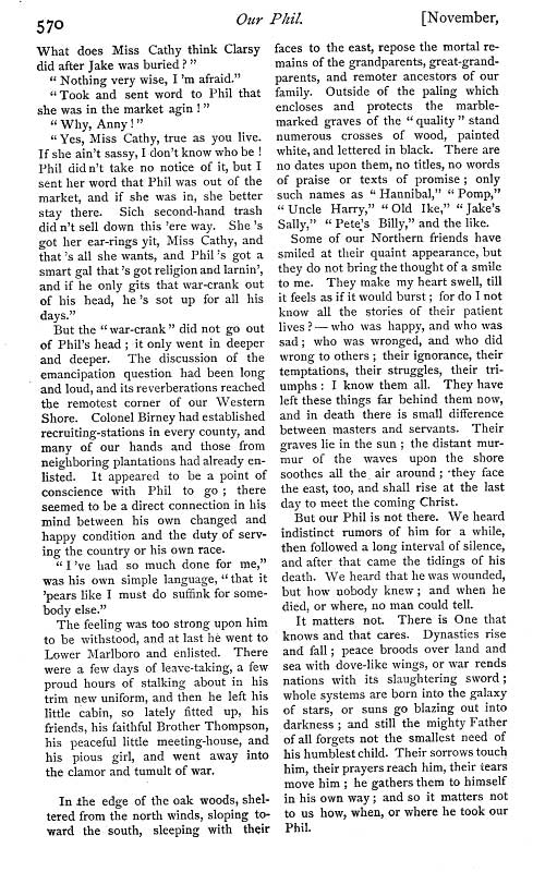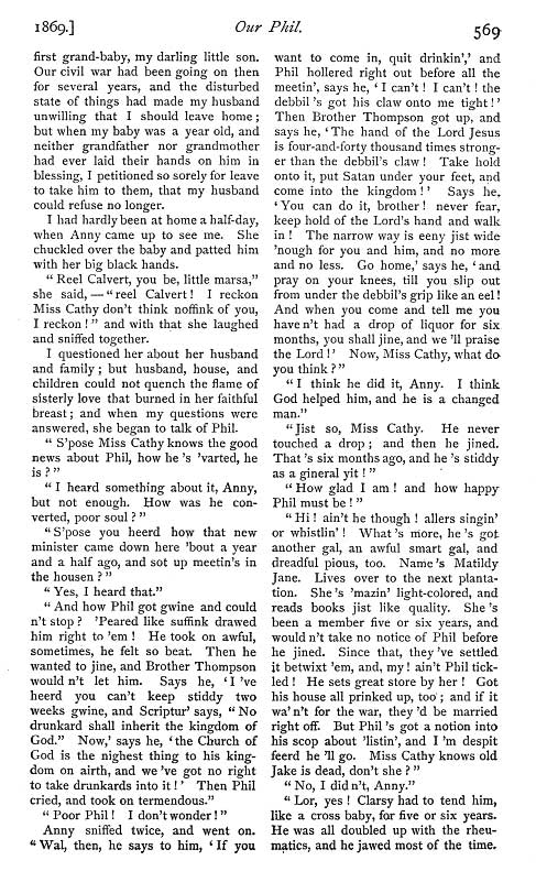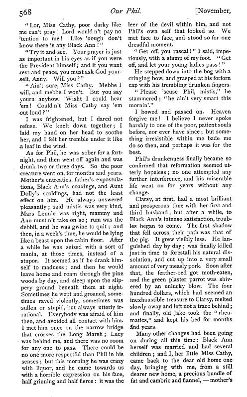 "Our Phil and Other Stories" By Katherine Floyd Dana Boston & New York Houghton Mifflin & Co. 1889 These are three simple little stories of the Western Shore of Maryland in the days before the war. They first appeared 15 years ago in the Atlantic Monthly under the pseudonym of Olive A. Wadsworth. It is a great pity that the peculiar social conditions existing at the South in the time of slavery should be left so nearly unrecorded as they have been. We are obliged to look now almost entirely to the works of Mrs. Stowe, who was writing about a state of society foreign to her, and writing for the purpose of undermining the foundations of that society. As people who have now passed the middle of life gradually disappear, those who can tell from their own recollection of the old plantation life become fewer. It is hardly likely that a writer of genius or even a talented writer, will be developed among them. There is still hope that some one, preferably perhaps some woman of the succeding generation, will yet give us a sympathetic account of what she has at least heard firsthand. For the state of Society at the SOuth before the war was unlike any that existed elsewhere - a condition at once curious and romantic - and there were lights as well as shadows in it and in the relation of master and slave. The little book before us will do something toward filling the gap we complain of. It is true the people described in it are not slaves, but they have been. "Long before the eventful hour when the great public proclamation of freedom broke every bond in the land with one blow, the process of emancipation had been going on slowly, but very surely in those sections of the South that bordered on the Northern states". But we see in the humble heroes and heroines of Mrs. Dana's stories the old feeling of dependence has not quite been lost. "It was true that Ed had tried to move away more than once from the old place and had failed. Others tried it too. Ceaser moved away one week and moved back the next. Pomp had tried it. Ben the surliest, sulkiest fellow on the whole place had tried it, and was unsuccessful, for he moved away seven times and at last gave up as an aimless excursion and settled down in the spot where he was born." Nor is there any doubt as to the relation of master and servant. The position of "the quality" is fully recognized. Good Old Aunt Rosy who always " walked with her head held high in the air and her elbows squared - that is, if it is possible to square such a circle as her arms were - and with the rolling gait that could afford to appear unsteady because it was really so firm. Her great cushioned feet came down with elephantine weight and softness, silent as the cat;s, but shaking the earth, and as she stepped she always seemed to sink an inch or two before she came to the solid, as if she scrubbing brushes strapped to her soles and the bristles bent under her weight. Hundreds of times when we were all little and Aunt Rosy had washed and dressed us for dinner, she would take Lucy and me in her arms and Fred and George on her back, singing in a fashion of her own: 'Aunty Rosy's pinky posies, two in her arms two on her shosies' then she used to settle down, so as she walked, it felt as if she were going through the floor ; but she never did, and so, enviorened and surmounted with children, she carried us down the stairsm across the broad hall to the ding room and deposited us safely in our seats." Nor less delightful is Dick, "the very genius of deportment," though we hear less about him ; nor Sancho, who owns to being light-headed but not light-fingered. "I'm so feerd o' gittin cotched I dursn't hook noffink!" His mistress believes him. "I can't think you would look me in the face," says she, "and tell me what wasn't true." "Oh bress my heart, mistis that's easy nuff!" answers the boy. "I've done it lots of times. Oh bress my gizzard! I've told Aunt Dolly more'n leventy thousand lies sence I lived to de house!. Bress all my insides ef I ain't told Dick a couple of dozen to-day!" We can but say of Mrs Dana's stories that we wish they were longer and that there were more of them. |