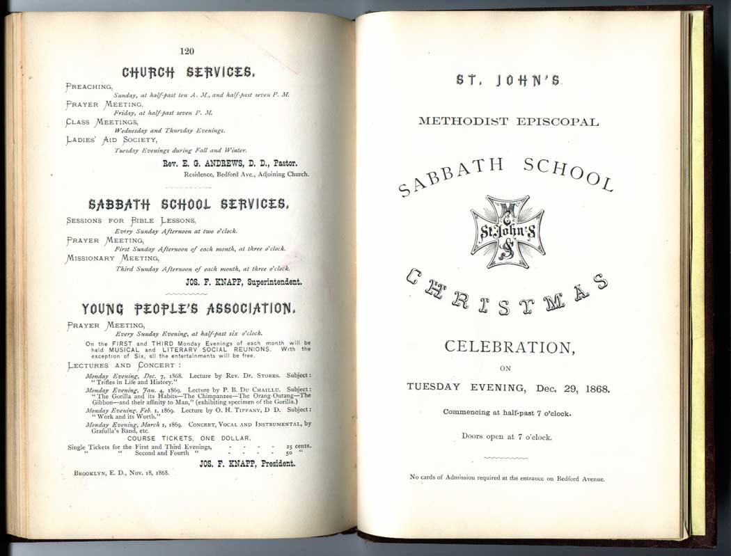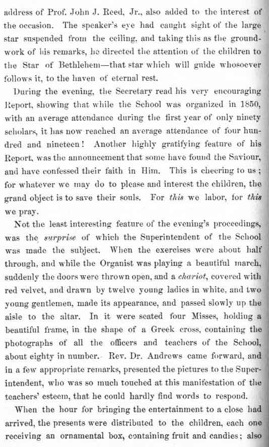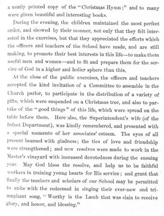 The book contains reports, report cards, forms, by laws, constitutions, instructions to the teachers and more on all the activities connected to the school. Many poems (of which Phoebe's friend Fanny Crosby composed a bunch) and passages that relate to each group of scholars of which there were 75 with names like "Little Twigs" and "Friends of the Heathen" all broken down by ages and sex. Also included are stories of past social activities like this very timely one in December of 1868 when J. F. Knapp was rendered nearly speechless and Phoebe too was greatly surprised by.
