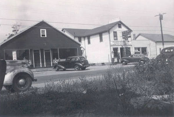 This view of the North Side of Neighborhood Road, just west of Elder Dr and about in the center of town in Mastic Beach circa 1941 is showing from Left to Right : Izzy's Hardware, The Mastic Beach Drug Store. The Stop & Shop. H C Grand's 5 & 10 and Watrous Hardware. Notice the field that the pic was taken from . There are no small shops that would be built there, save for a roof of one that is partialy visible on the right. Great Ford coupe parked in the foreground !
