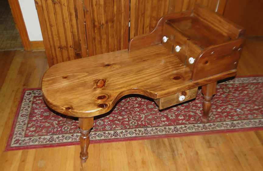 My name is Ken Spooner. As you can see I grew up surrounded by pine and have been in the musical arts all my life. I started doing wood work in my junior high school days in the late '50s, When my shop teacher, Mr. LaBianca sold my first coffee table ( A Danish Modern walnut one ) for $40.00 at an industrial arts exhibit, he encouraged me to "stick with it". I sort of took his advice. Most of my life I have been in many phases of the music and performing arts . In the seventies, growing weary of the music biz, I started a handcrafted pine furniture shop on Long Island, NY. It grew rapidly with several employees, but the music biz beckoned again. After decades of writing and producing music, performing, and even retailing it ( I had a specialty guitar shop) I began wood working again at the start of the millenium. It was mainly for recreation, building some pieces for our new home and occasionally making something to sell to supplement social security.
