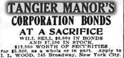 Quinby's initial 1910 companies,Tangiers Manor & Tangier Development Corp. went belly up in 1912. Before they did initial investors of which there were only a few, were dumping the stock that would soon be worthless.