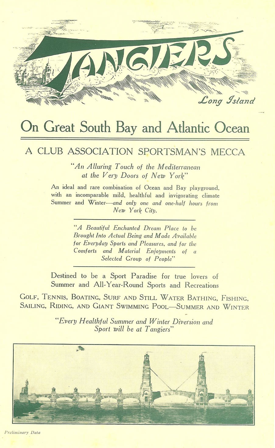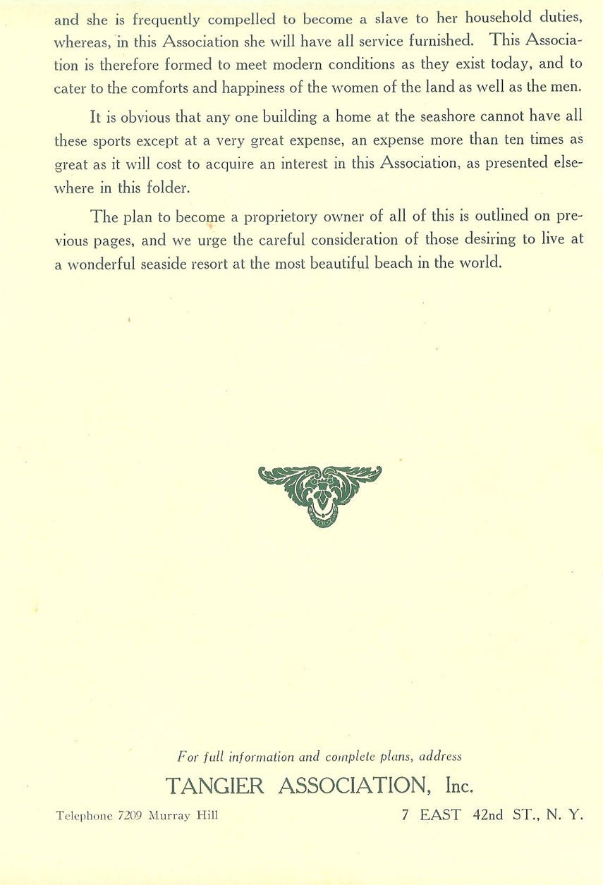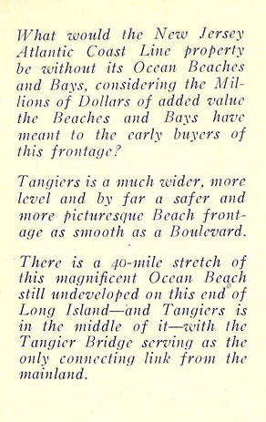 By 1918 the infamous Hawtonherst Corp. who tied up clear titles to much of the Tangier Land for years preventing any resolution had taken things over out there, so I am reasonably sure this brochure was printed between 1913- 1917 when America entered the World War.