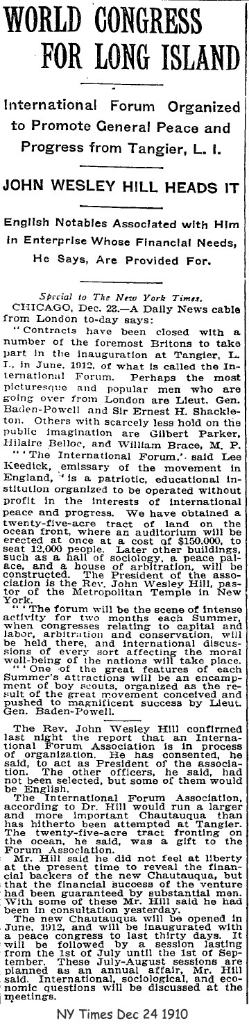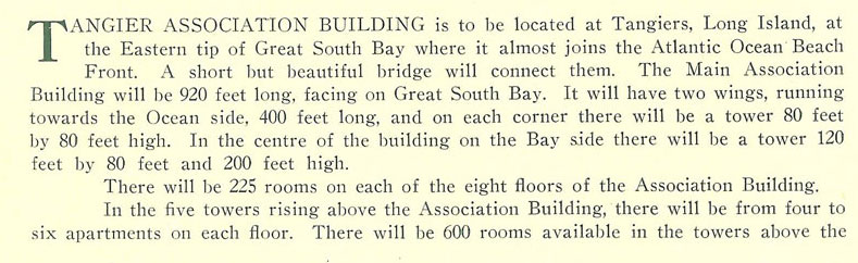 In 1913 "a syndicate" with a US Senator, William Hughes from NJ, as trustee was involved in Tangier's restructuring, That unamed syndicate wound up in a big 100,000.00 lawsuit from one angry investor but no names are mentioned in this new found Tangier Association brochure. The only hint of a perhaps a major investor is the fact that there is a Howard Blvd as the main thorough fare on Fire Island. Their NY City address is also different than that of the original Tangier Company in the Cameron Bldg on Madison Ave.