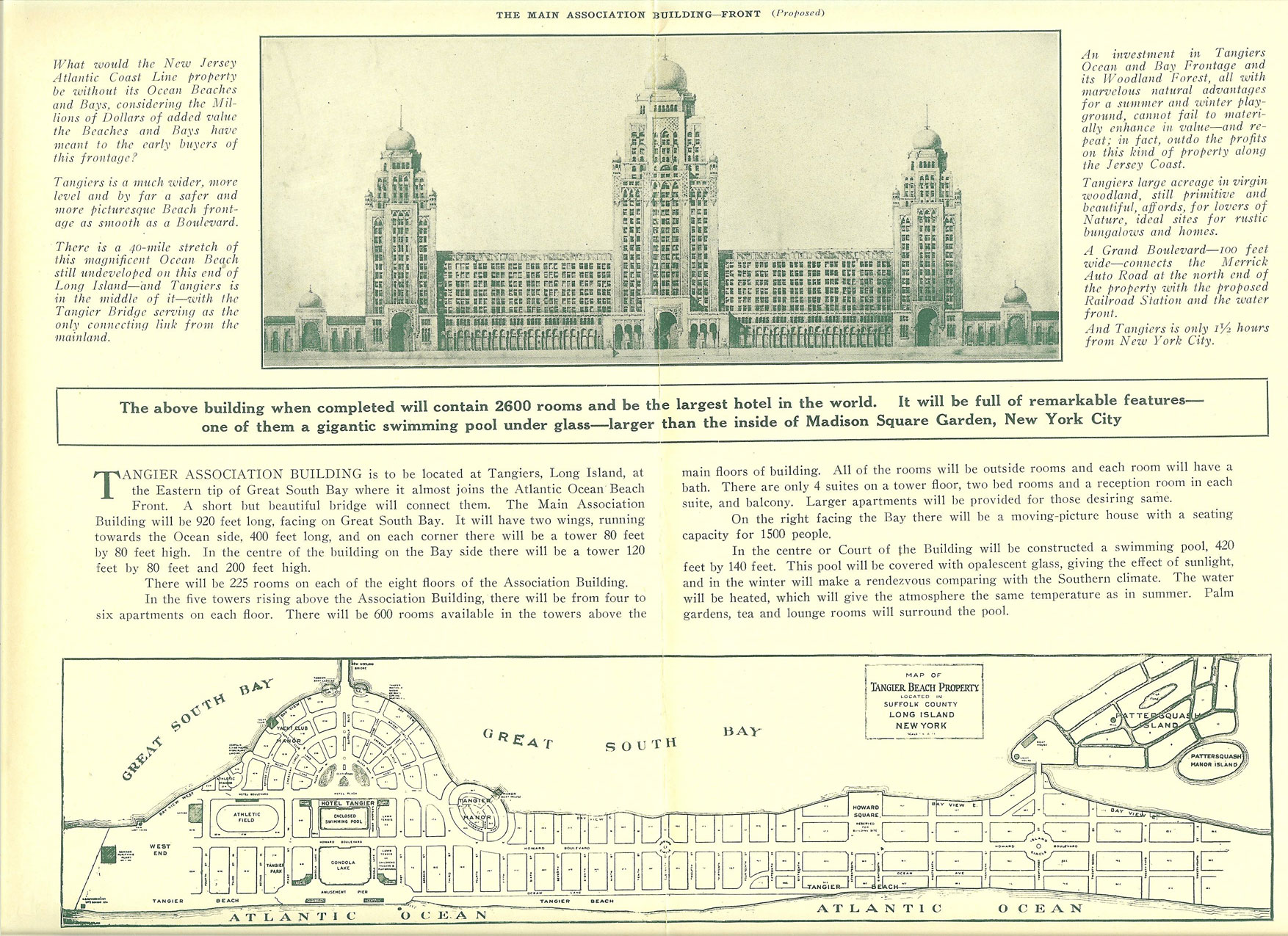 The plans here are still very grandiose and in some aspects even grander. An even bigger proposed bridge is there along with the wide Suffolk Blvd. The major difference I see is there is no talk of any real estate development or creation of a town center. Only "Woodland Forest" another mythical place, gets a passing mention. The sales pitch here is for ocean front living "Atlantic City, NJ " style in the largest co op hotel in the world (2600 Rooms)