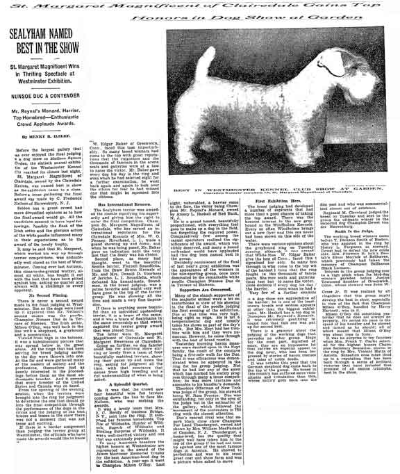 On the floor it was SRO and everytime the judges even looked at the setter the crowd went wild. The judge for best in show was C. F. Neilson who was a longtime Irish Setter breeder and at onetime was the financial backer of O'Boy. From the rafters they were cheering for the rollicking Irishman and many legitimate dog people thought it was going to be O'Boys night. Nielson who took his job very seriously studied all six finalists carefully and all though the crowd at this point was clearly pulling for O'Boy , Nielson was torn between the Sealy & the Poodle. He asked both of them to move again, studied them further and as the cheers died down walked to the table, wrote something down, turned around with the big rosette and silver bowl walked past the poodle and the setter delivering it to England and American Champion St. Margaret Magnificent of Clairedale.. He knew there would be disagreement but his decision was both confident and bold . On this night and in his opinion, the Sealyham deserved the honor.