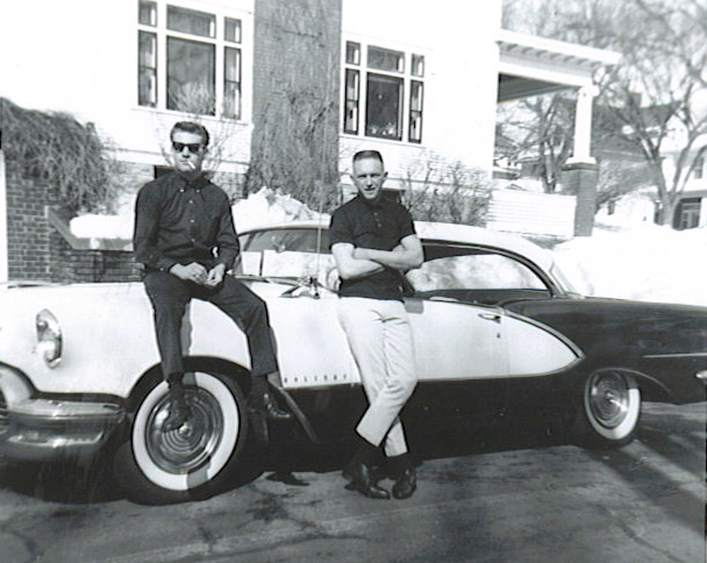 What an upside down year 1961 was... it was the only one of the entire 20th Century. I was fresh into high school and these two dudes were fresh out of it. That's Joe Monteleone in the wayfarers paying a visit to his bud Phil VanTassel who relocated to Minnesota fresh out of Floyd.