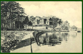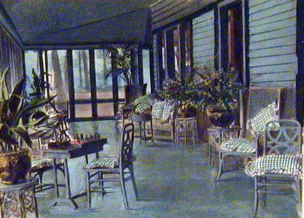 Moss Lots was the central showplace of the Dana Estate. A huge victorian mansion that William B. Dana built for his wife Katherine in the early 1880's. This is a very rare color view circa 1920 of a part of the verandah that surrounded three sides of the home offering up vistas of Forge River, Great South Bay and Poospatuck Creek. First Lady Eleanor Roosevelt was a visitor here in the 1930's. For more about The Dana Estate including a tour inside the home and The Dana Family click here.