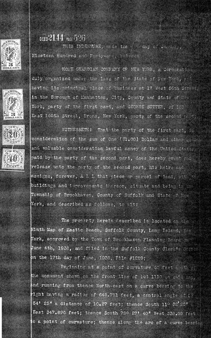 JANUARY 9, 1941 HOME GUARDIAN SELLS MANSION TO GEORGE SUTTER.... who was he? I know very little at this time, but I plan to look into it. He lived in the Bronx, and as of 1949 was still listed in the Mastic Beach directory as living on Dogwood Road (though the back of the house faced Dogwood this was where the driveway into it was located and Mansion's formal address)
