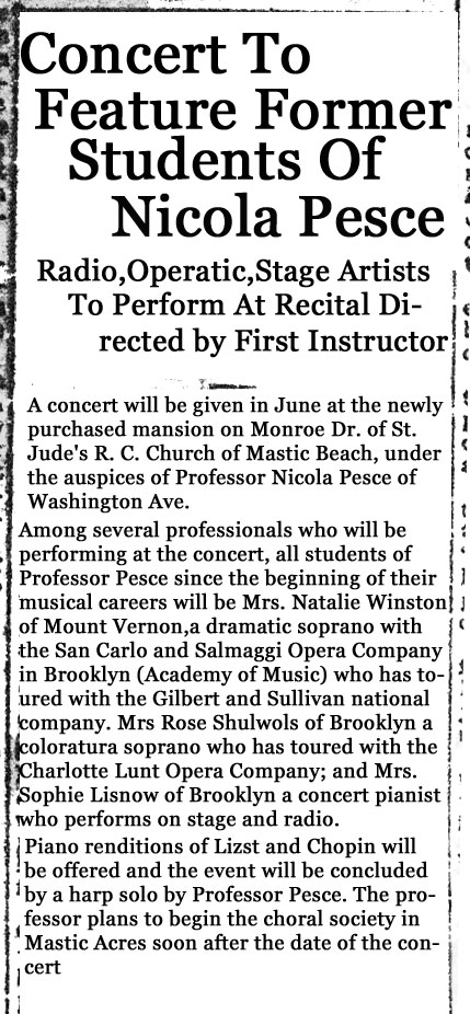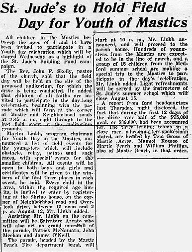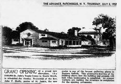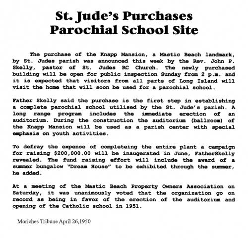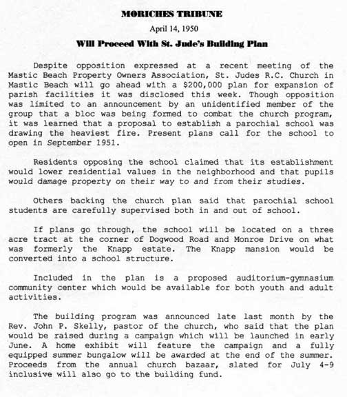 Unable to contain his joy Fr. Skelly announced his big plans in March of 1950 two months before George Sutter's pen hit the paper. He wanted to make a school out of it, and build an auditorium parish / community center open to all in the backyard. In April at a meeting of the Mastic Beach Property Owners someone who remained un identified voiced their opposition by saying it would "Lower their property values" ( ????) and that the kids going to school there would cause damage to the neighborhood (?????) Who was this GUY? and what was he thinking? The Moriches Tribune ran the story in April of 1950.