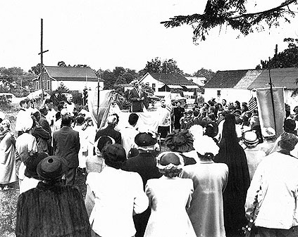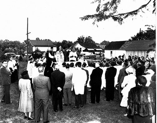 George Sutter signed on the bottom line 8 days later making it official and Fr Skelly had himself a rectory, parish house, community center, and future school house all combined. Big plans were drawn up, the Brooklyn architecual firm of Beatty and Berlenbach who had designed numerous church projects were called in. And on very cool for June afternoon, the Fr Skelly and 30 other clergyman, some alter boys and 50 or so of the faithful flock broke ground out near the garage in back of the mansion. Bishop Molloy of Brooklyn was not able to attend, however the Bishop Of Reno NV came marching in and a splendid time was had by all.