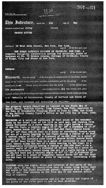 As stated in the church press release, Father John Skelly started out by renting the Knapp Mansion for use as a rectory. He must have noticed he had room to spare in there. A man of vision and great persuasion he had big plans for it if he could somehow convince Bishop Molloy to purchase it. But who even knew if the new owner, George Sutter wanted to sell it? Perhaps Fr. Skelly came up with the idea while meditating in the grand ballroom under one of the paintings the Knapp's left behind or while pacing one of the 2nd story terraces on the east or west wing. Whatever happened, by May 4th of 1950 ( my brother Butchie's 7th birthday) the current owner George Sutter was signing on the dotted line and conveying the Deed to the mansion to The Diocese Of Brooklyn. The price... $15,000.00 placed in a trust fund by the Diocese. A pretty good price for a place that was only around 30 years old and had the best of everything in it including furnishings. If Home Guardian had paid over $55,000.00 for it * they certainly didn't it sell it to George Sutter 8 days later for less than that. So as rumour always had it in Mastic Beach, The Knapp Mansion was a gift to the church....it just wasn't a gift from the Knapp's, who by the way were Methodist.