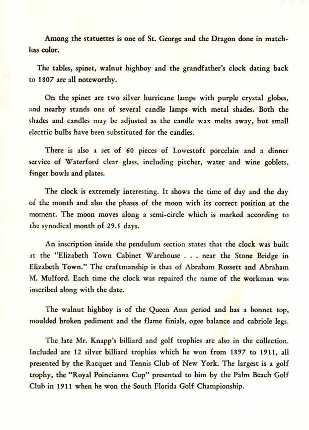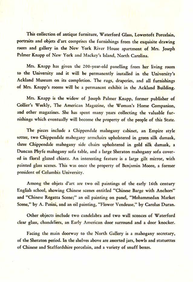 On this page I am attempting to give you glimpse of what it was like on the inside. Helped by a photo taken from a typical sun room that each apartment had and by a brochure of an exhibit of The Knapp Collection that is held by the University Of North Carolina.I hope to be able to photograph some of it when I visit the campus in 2004.