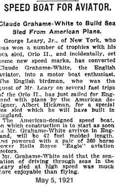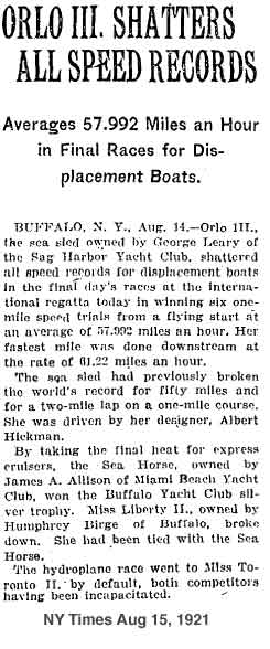 In 1920 Hickman opened a boatyard in West Mystic, Connecticut and started building a series of raceboats with the peculiar name of ORLO. In Feb 1921 at the Fisher Trophy Series ORLO II broke the record for marine (rather than aircraft engined) "displacement" boats. She lost the race because of poor turning ability and an engine that Hickman believed was sabatoged.