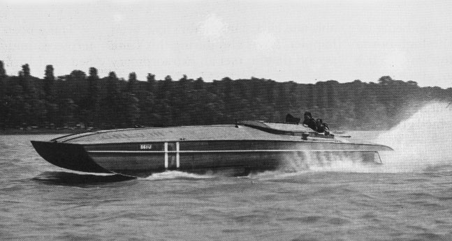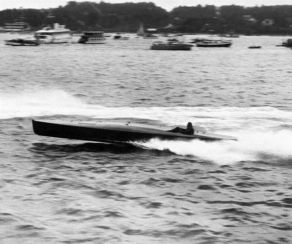 SEIDMAN: Two years later Hickman gave racing another chance, this time in partnership with George Crouch a prof at the Webb Institute for Naval Architecture. (and a Sea Sled owner / advocate) They worked together on building Rainbow IV for Canadian yachtsman Harry B. Greening. Crouch's hull was double ended with transverse lapstraking bottom. She planed amidships with her pointed stern supported by a Hickman surface propeller that delivered 18% lift and 82% thrust.