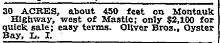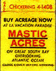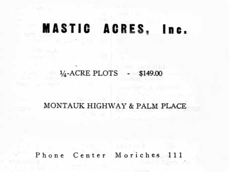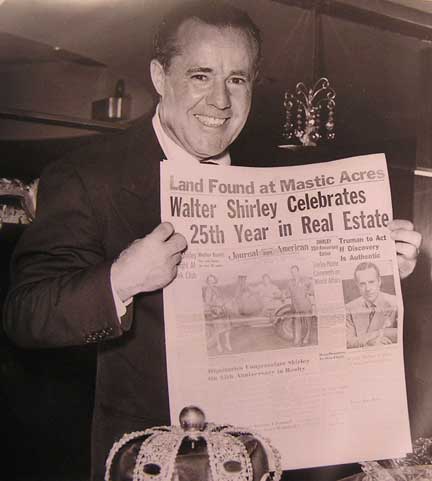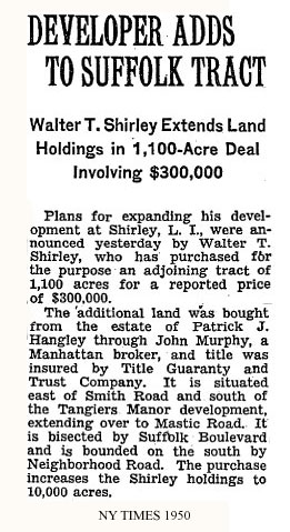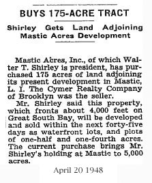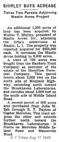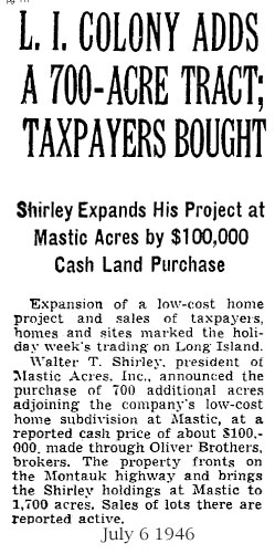 I heard this story through Kenny Vitellaro who has lived in one place in unit 11, Mastic Acres - Shirley his entire soon to be 57 long years. The story came to Kenny from the late Bill Dietrich (Shirley's first property manager). Back in te 1970's Kenny was asking him about how Shirley came up with the names he did for the streets. Bill told him that Revilo Ave. (Which runs North from Victory Ave to the LI Expressway was named for the land Walt got off a guy named Oliver. Revilo is Oliver in reverse... Kenny has more Bill Dietrich stories that you will be seeing in the pages ahead. Not to mention the Vitellaro Story which as the longest living resident of the town needs to be told!....... I also recently have heard via E mail from John W Liberti, a young realtor who's realtor father and uncle I went to Floyd with. It turns out that John W's mother is the daughter of Bill Dietrich. I am hoping that John's offer to put me in touch with his Mom pans out. I'm sure she has a story or two she heard from her Dad.