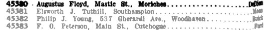 AUGUST FLOYD, LIVED HERE , JUST NORTH OF THE WILLIAM FLOYD HOUSE ON HOME CREEK, HE WAS A LAWYER AND AT THE TURN OF THE CENTURY, WAS VERY ANTI AUTOMOBILE . HE WROTE LETTERS & NEWSPAPER ARTICLES AND CAMPAIGNED FOR STRICT SPEED LAWS. THAT SAID IN 1914 HE WAS DRIVING TOO ....