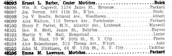 Builder Ernie Barber had the concrete block firm of Barber & Smith in Center Moriches and built many buildings (like the Bowl-Away) in the area. Barber & Smith also did the concrete livestock and landscaping pond work I saw on the Knapp Estate. Like Mr Luckert, Ernie drove a Buick too. Frank Mauran Lawrence's, sister Emma who along with her sister Elizabeth always lived in the Mastic (beach area) on the Lawrence Estate , was chauffeured and rode around in her Packard, probably similar to this 1913 model .