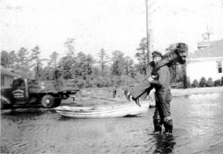 Beach is shown here carrying Mr. Stiritz across a flooded Neighborhood