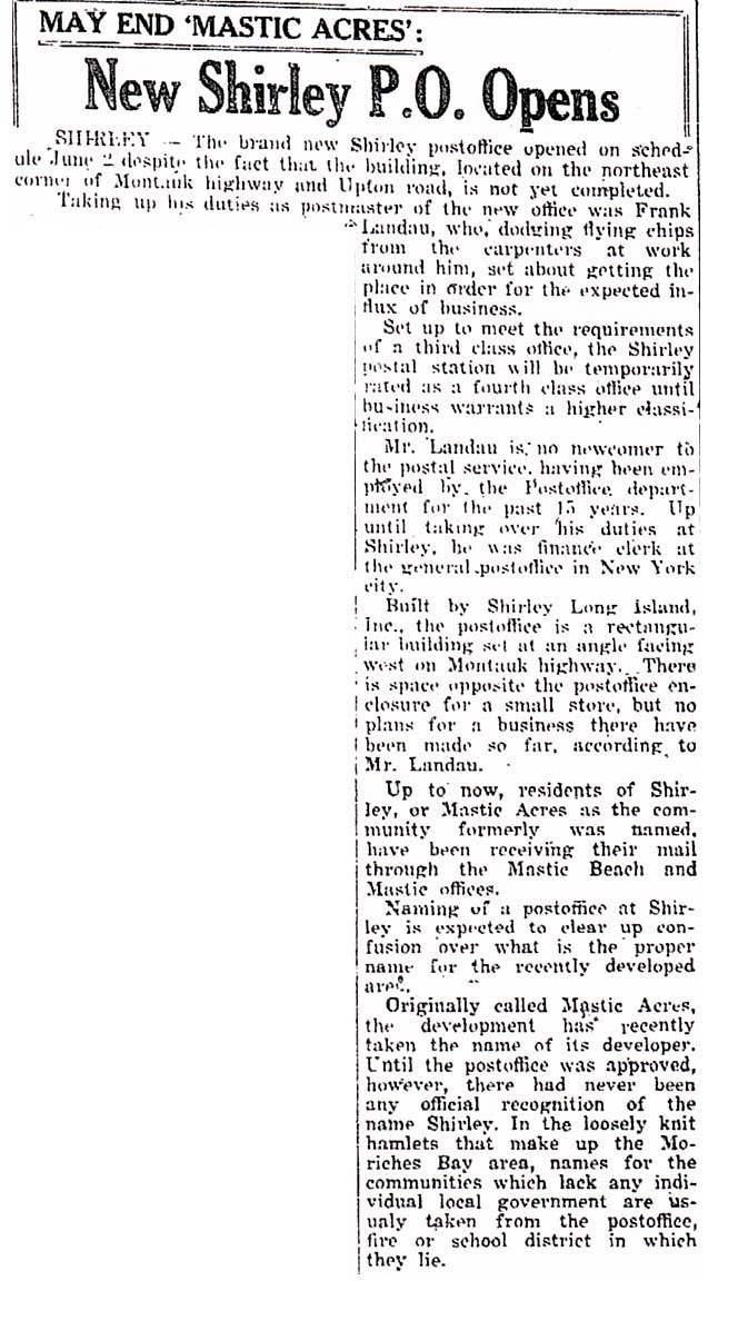 Mastic Acres in 1944, Shirley always inserted SHIRLEY, LI as the
