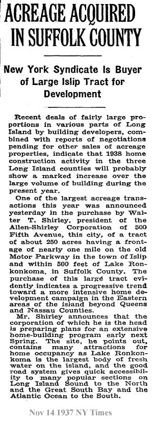 I saw a solid gold horse shoe on his desk and asked about it. It turned out to be a memento from the great heavyweight boxer Fitzsimmons and before you knew it, we were comparing notes on all the great fights of the century. (Shirley had been hanging around with all these guys from his days at Billy LaHiff's Tavern which was the New York mecca for prizefighters) Next thing you know I'm showing him how Dempsey KO'd Firpo and Pancho Villa lost to Jimmy McLarnin ..... well an hour must of passed before he restated his initial question and finally said "Well Wally how much can you really afford?" ......... his cashier almost fainted when Willie K told him Mr. Shirley will be paying us $8,000.00 for the Ronkonkoma property.