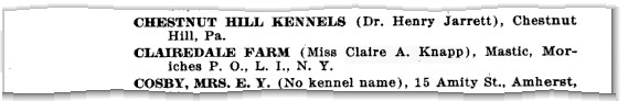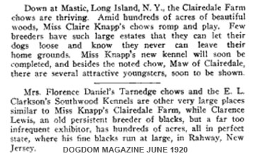 "...... a pair of female puppies to Miss Claire Knapp of Mastic, L. I. the owner of the late departed Ch. Princess Iris a noted Boston Terrier. Miss Knapp has decided to breed Chows and as she has a vast estate to experiment on, much time and money, she will indeed be a welcome member of the Chow fanciers"....Dogdom Magazine