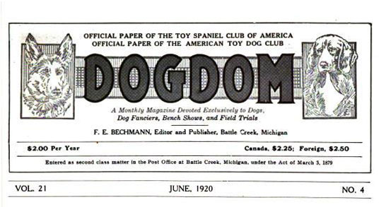 In the extensive pages I have on Claire Knapp and her reknowned kennel, I note that the first time I saw the name Clairedale appear in print was in advertisement in 1922 and it was located at the Knapp Estate in Mastic. Well that still holds true as for location, but this press release that appeared in the June 1920 issue of DOGDOM magazine reveals Clairedale existed even earlier than that and with a slight variation in name.