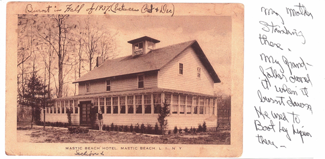 Paul Schulte Sr's Granddaughter , the late Greta Speiss Tucker sent me this photo along with others in her personal collection of Mastic Beach in 2002. Miss Greta writes : "Burnt in the fall of '37 between Oct & Dec" "My Mother standing there. My grandfather owned it when it burnt down. He used to boot Leg Liquor there.
