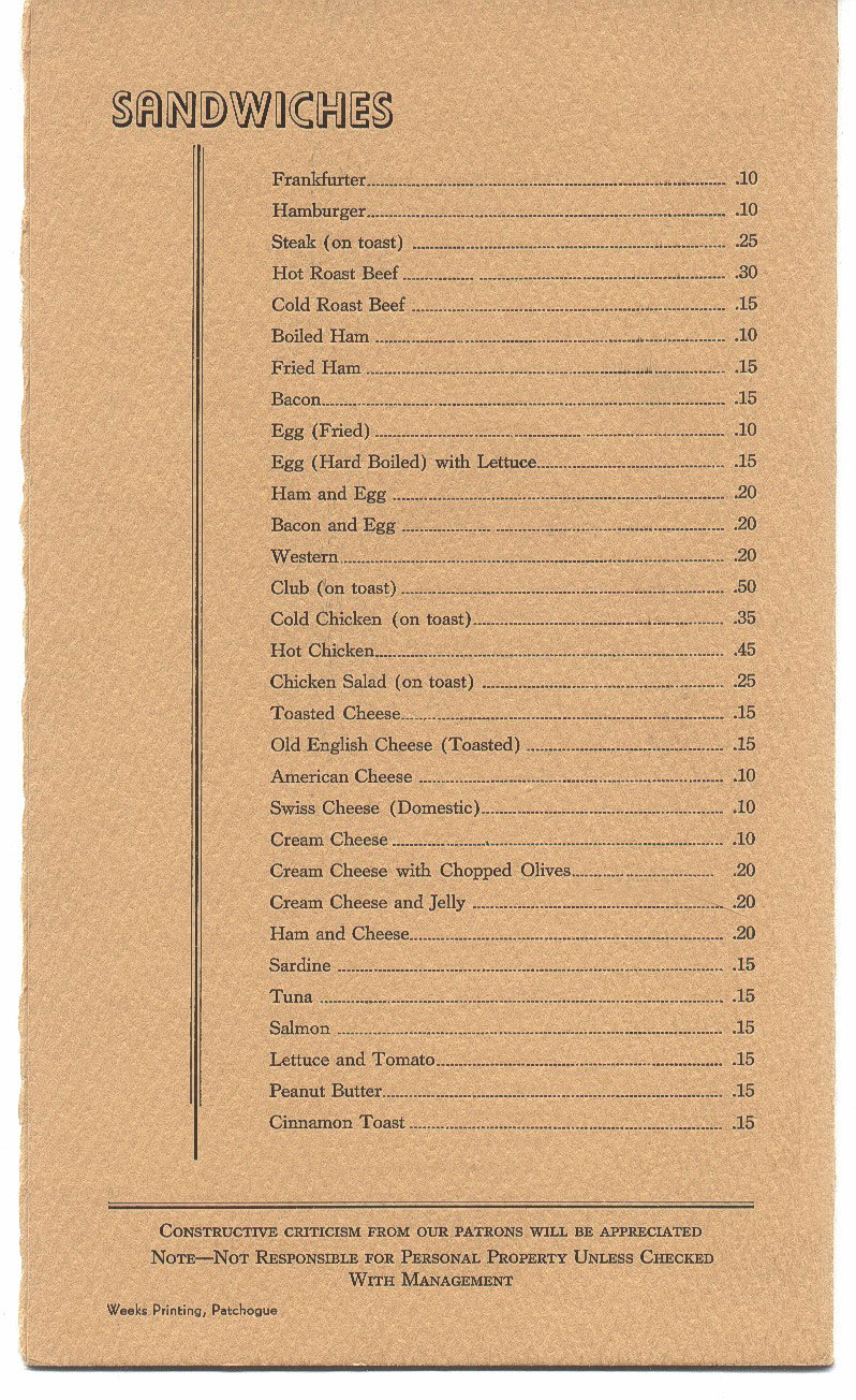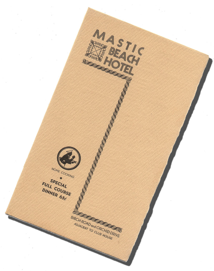 I found this menu,which is in absolutely pristine condition in Blue Point,NY on E Bay. It was printed by Weeks Printing Co. in Patchogue between 1933 - 1937 with my gut feeling that it was probably printed between 33-35 based on the selection of menu items offered. What follows the menu is my collection of stuff about the hotel already scattered all over this website,that paint the history of this once very colorful,historic but short lived Mastic Beach establishment. There also are many links to most of the other pages that contain more info and pics relating to Mastic Beach history.