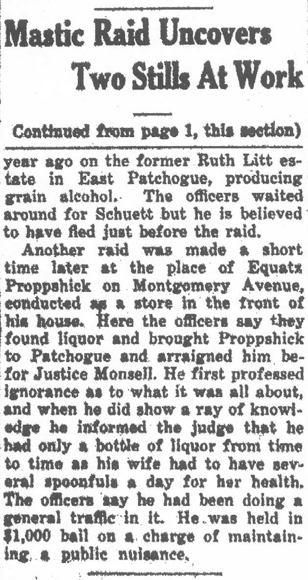 On my research trip in 2005 I found this article below about bootlegging in the Patchogue Advance from 1929.