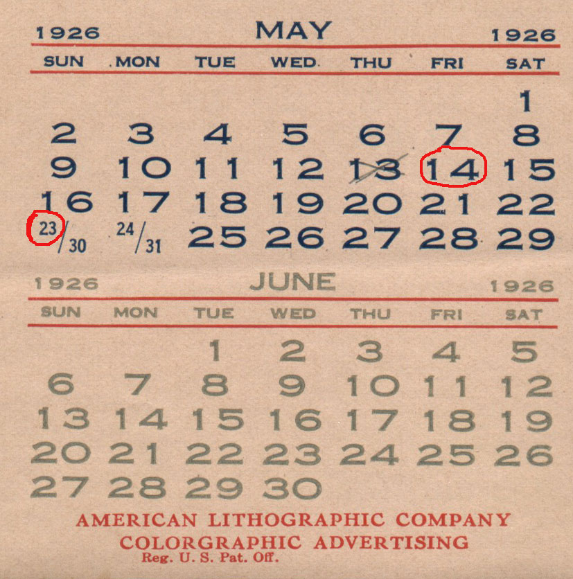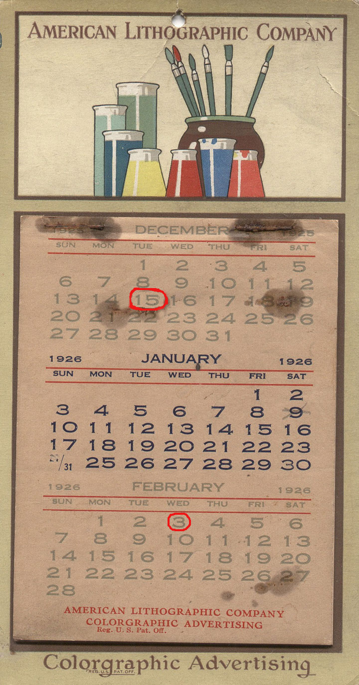 AMERICAN LITHOGRAPHIC CO. POCKET CALENDER FOR THE YEAR 1926