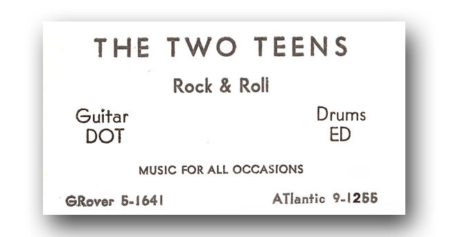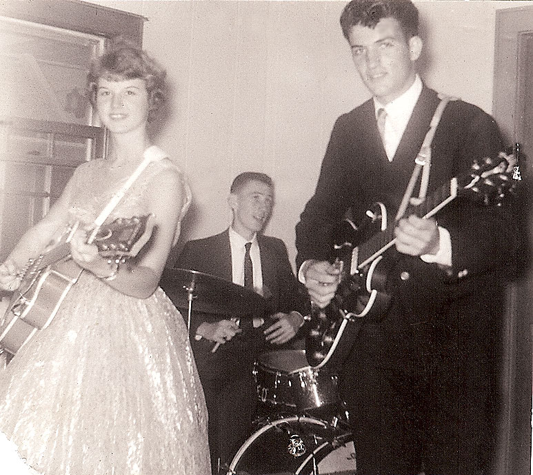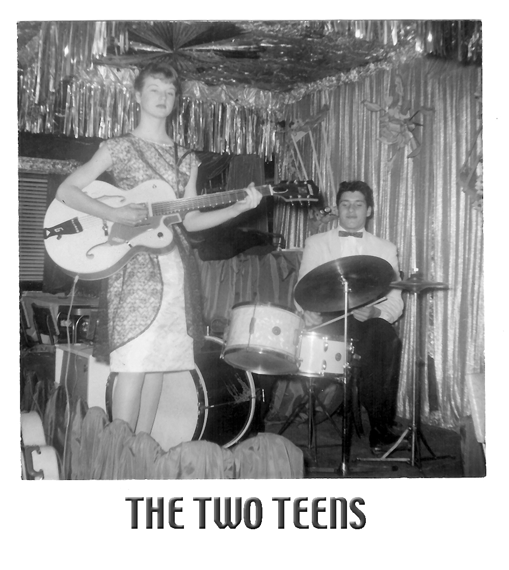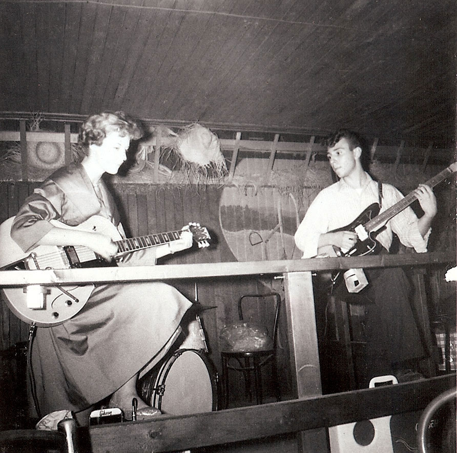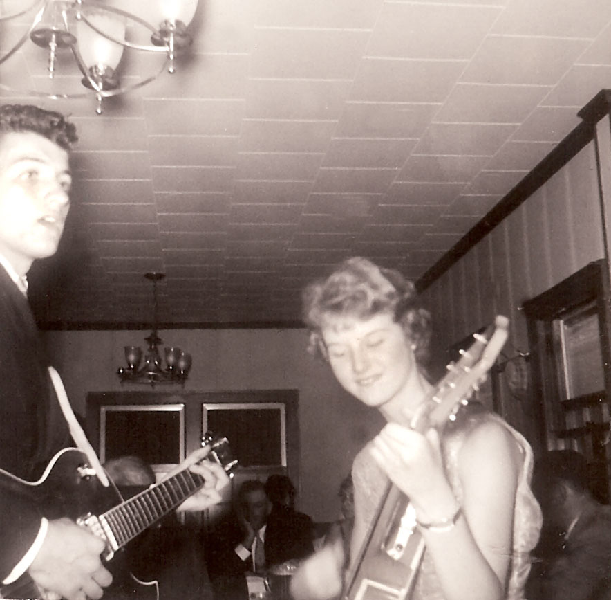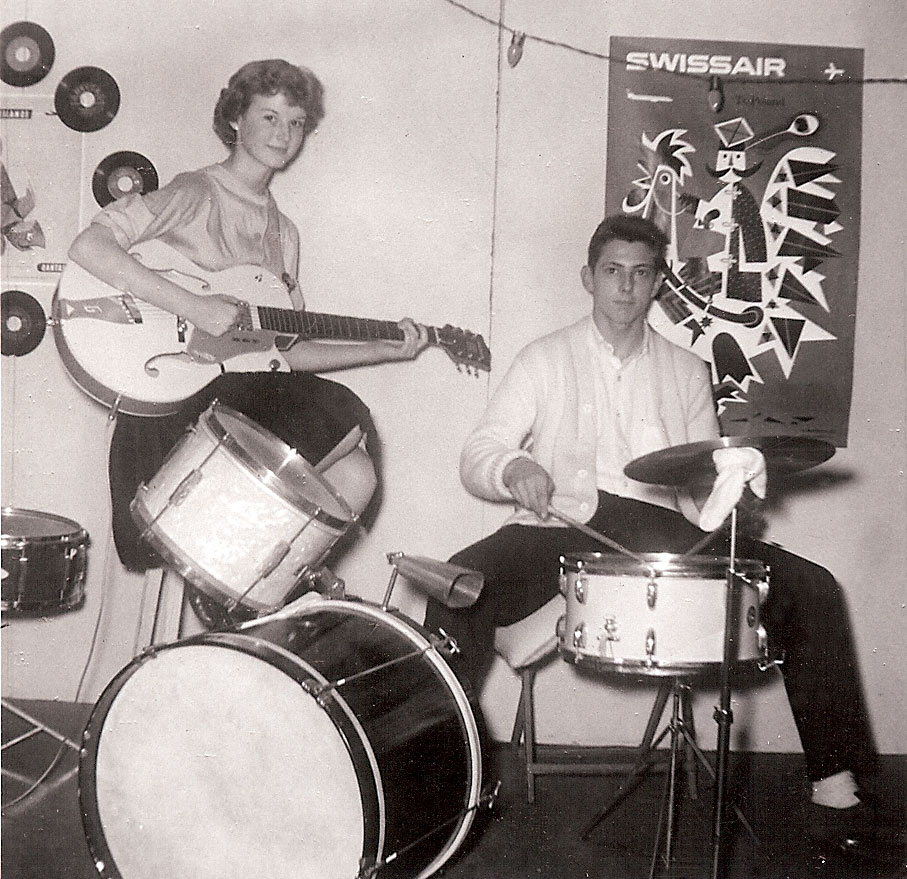 THE TWO TEENS IN THE RUTLEDGE FINISHED BASEMENT CIRCA 1959. BEFORE GARAGE BANDS THERE WERE