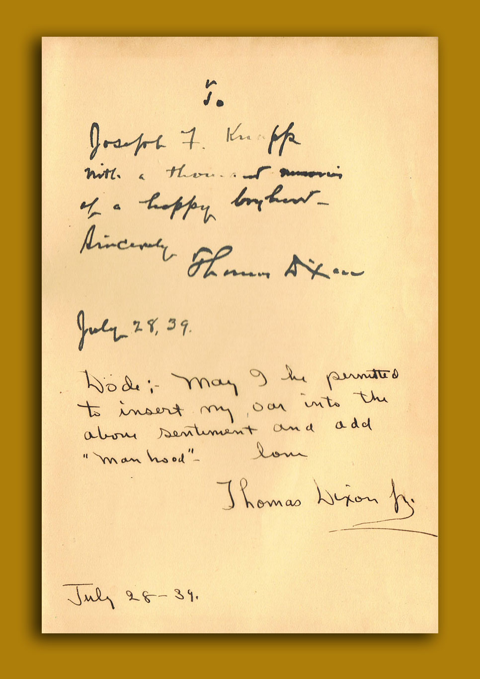 As we go to press, a gift to me of author Thomas Dixon’s last novel The Flaming Sword, cleared up the question of how Dodi spelled his nickname. It is inscribed To Joseph F. Knapp With a thousand memories of a happy boyhood _ Sincerely Thomas Dixon -- Dode: May I be permitted to insert my oar into the above sentiment and add "manhood" Love Thomas Dixon Jr. July 28, 1939 I had never seen Dodi spelled that way. My research found a 1907 Cincinnati Red’s outfielder, George “Dode” Paskert, who was known for his speed. As late as 1949, Joseph F. Knapp, still enjoyed demonstrating his running ability.